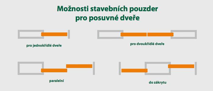 Do zdi můžeme posouvat dveře jednokřídlé i dvoukřídlé, od sebe i na jednu stranu za sebe. Ovšem pokud se rozhodnete zvolit posuvné dveře se stavebním pouzdrem, je nutné počítat již při projektování.